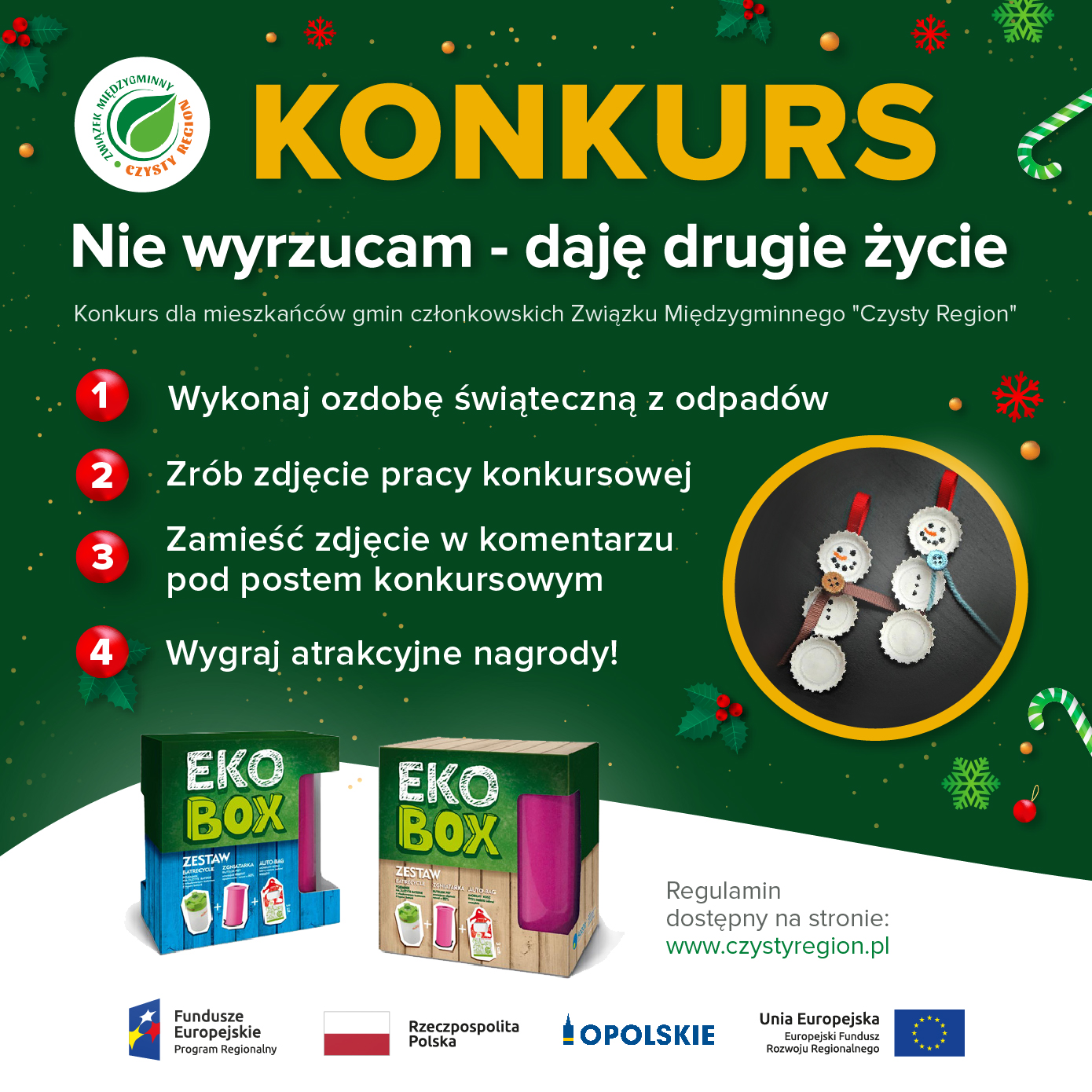 Zapraszamy do wzięcia udziału w kolejnej edycji konkursu "Nie wyrzucam - daję drugie życie"!Wykaż się kreatywnością i wykonaj eko-ozdobę świąteczną (z wykorzystaniem odpadów lub materiałów naturalnych). Zrób jej zdjęcie i wklej pod post konkursowy zamieszczony na naszym portalu Facebook.