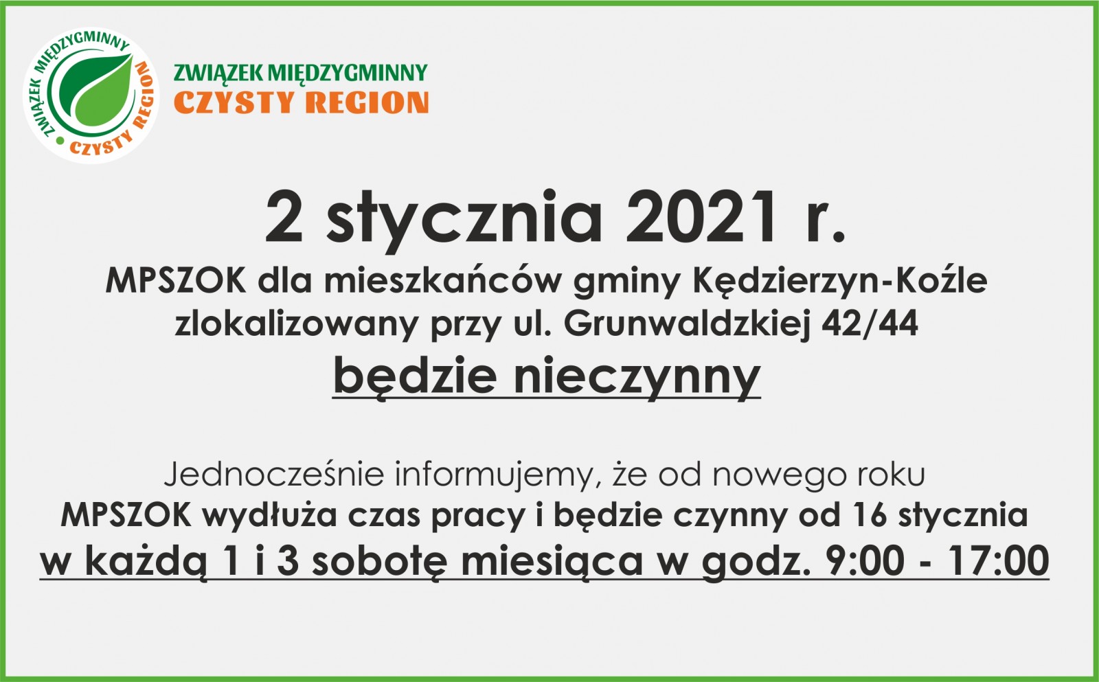 - 2 stycznia 2021 r. MPSZOK na ul. Grunwaldzkiej w K-Koźlu będzie nieczynny