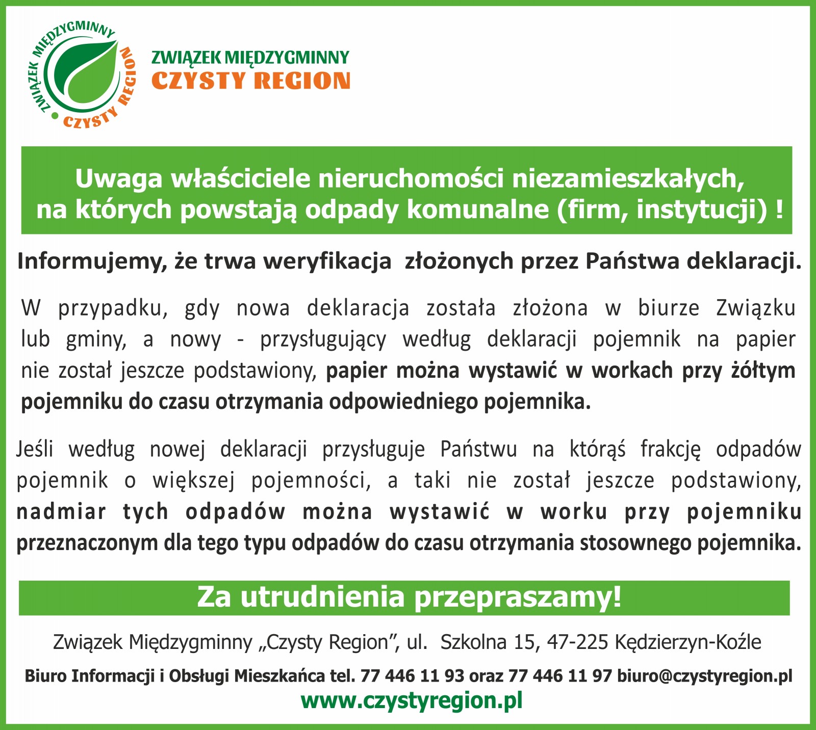 Komunikat dla właścicieli firm i instytucji w sprawie zmiany deklaracji i podstawiania pojemników