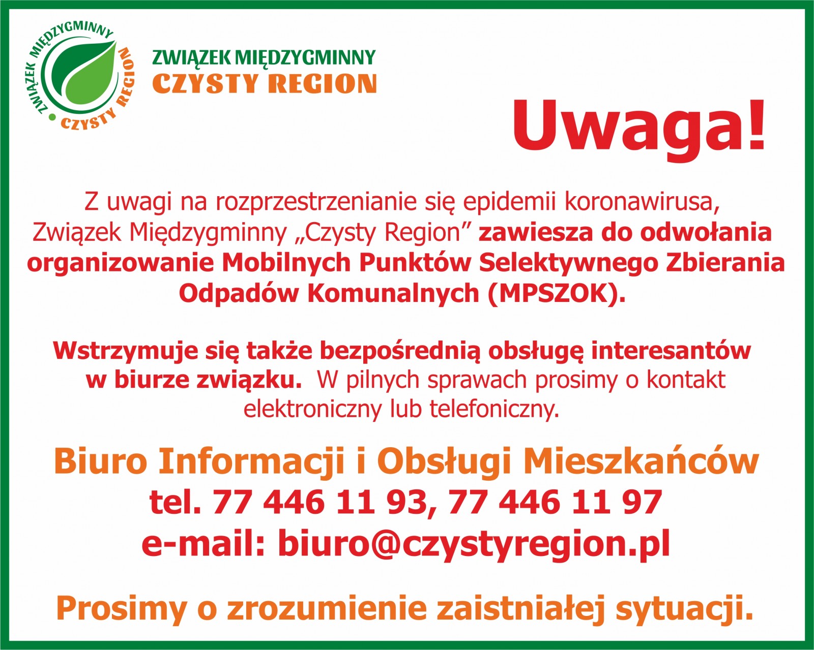 UWAGA! KOMUNIKAT OBOWIĄZYWAŁ W DNIACH 13.03 - 20.04.2020 r.
