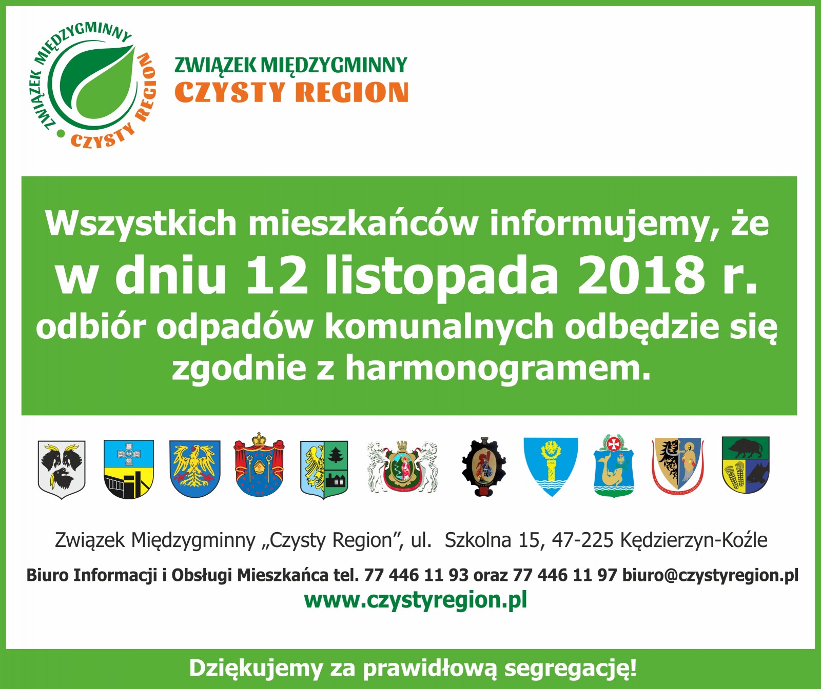 Wszystkich mieszkańców gmin członkowskich Związku Międzygminnego "Czysty Region" informujemy, że 12 listopada 2018 r. odbiór odpadów komunalnych odbędzie się zgodnie z harmonogramami wywozu.