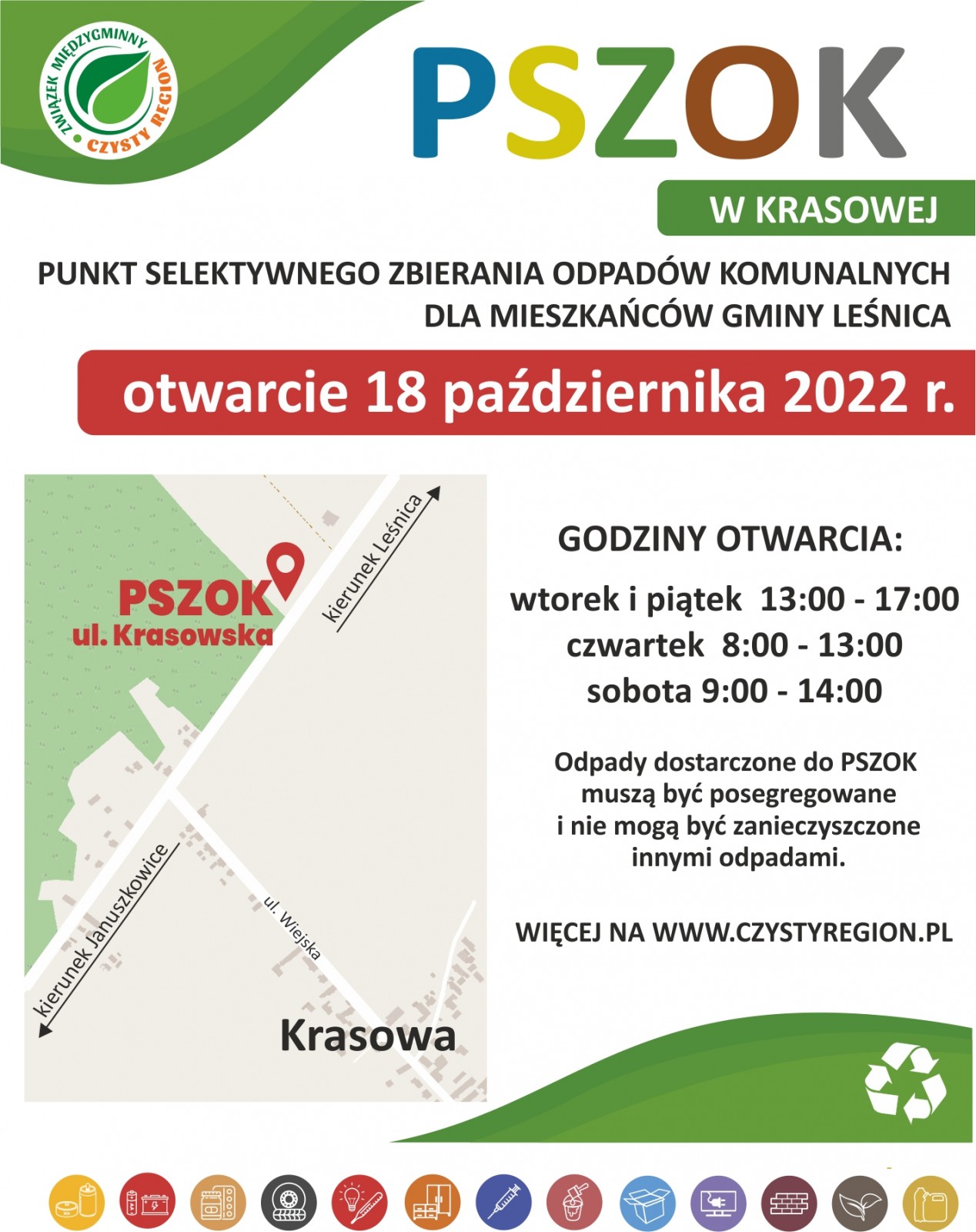 18 października 2022 roku uruchomiony zostanie Punkt Selektywnej Zbiórki Odpadów Komunalnych (PSZOK) dla mieszkańców gminy Leśnica w Krasowej.