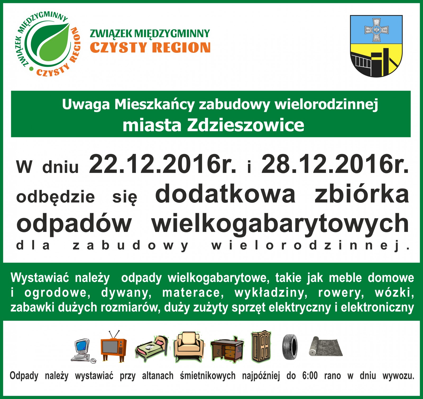 Uwaga mieszkańcy zabudowy wielorodzinnej miasta Zdzieszowice! W dniu 22.12.2016r. oraz 28.12.2016r. odbędzie się dodatkowy wywóz ODPADÓW GABARYTOWYCH.