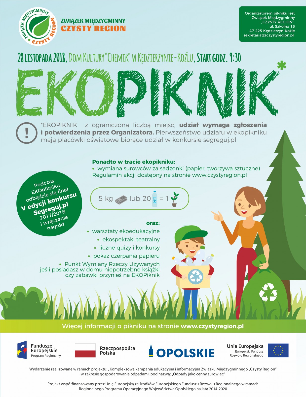 Odpady jako cenny surowiec” – to hasło kampanii edukacyjno-informacyjnej, realizowanej przez Związek Międzygminny „Czysty Region”. W jej ramach już 28 listopada br. organizatorzy zapraszają na EKOPIKNIK. Rozdanie nagród w konkursie Segreguj.pl, warsztaty ekologiczne, quizy i zabawy o tematyce prośrodowiskowej – to tylko niektóre atrakcje, czekające na przybyłych gości.