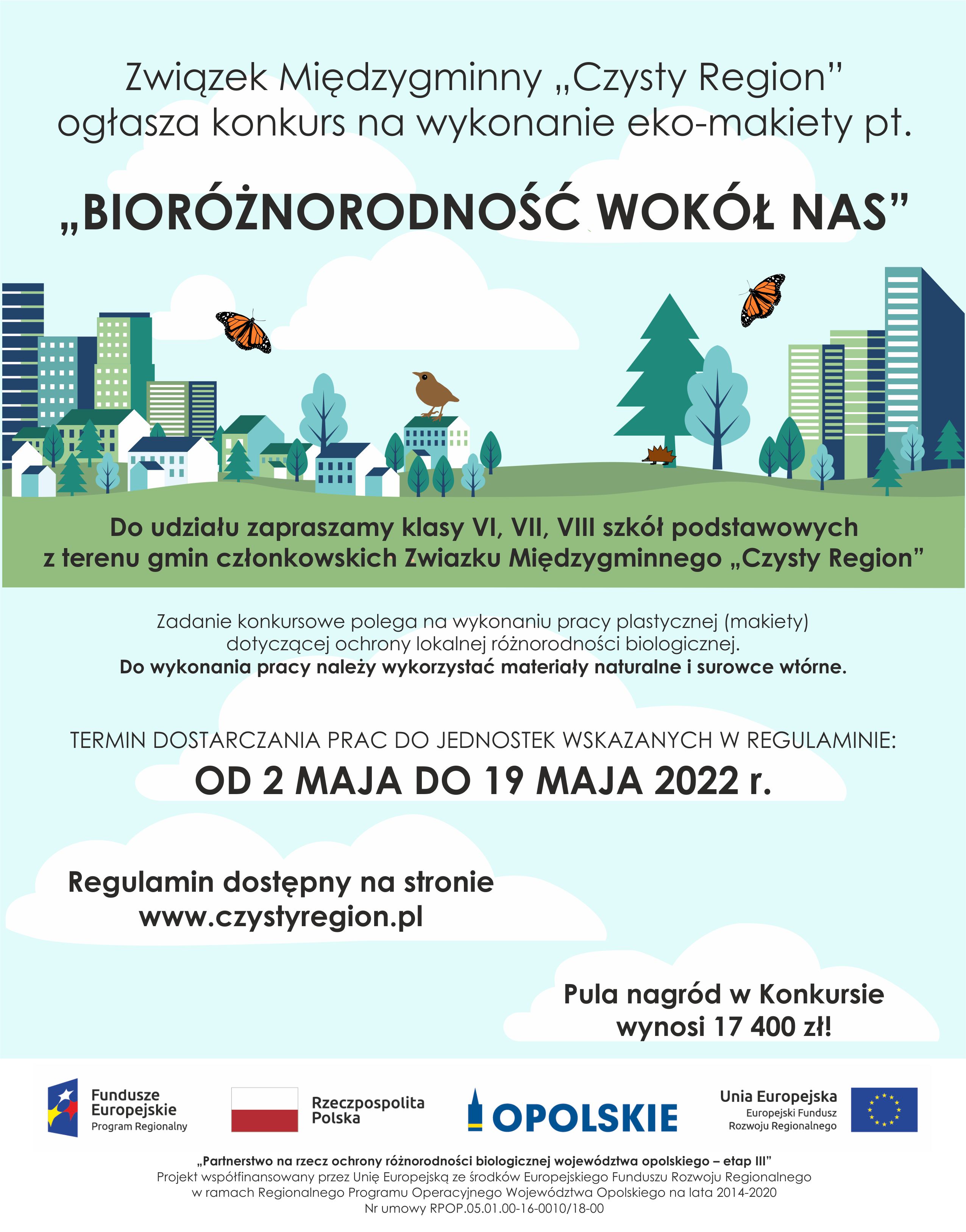 Związek Międzygminny „Czysty Region” ogłasza konkurs plastyczny na wykonanie ekomakiety pn. „Bioróżnorodność wokół nas”. Rywalizacja podzielona została na etap gminny i międzygminny, a wziąć w niej udział mogą klasy VI-VIII z terenu gmin należących do Związku.