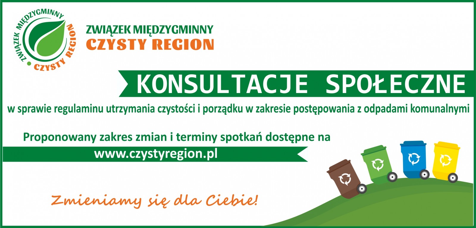 Związek Międzygminny „Czysty Region” zaprasza wszystkich mieszkańców na konsultacje społeczne, których tematem będzie zmiana regulaminu utrzymania czystości i porządku w zakresie postępowania z odpadami.