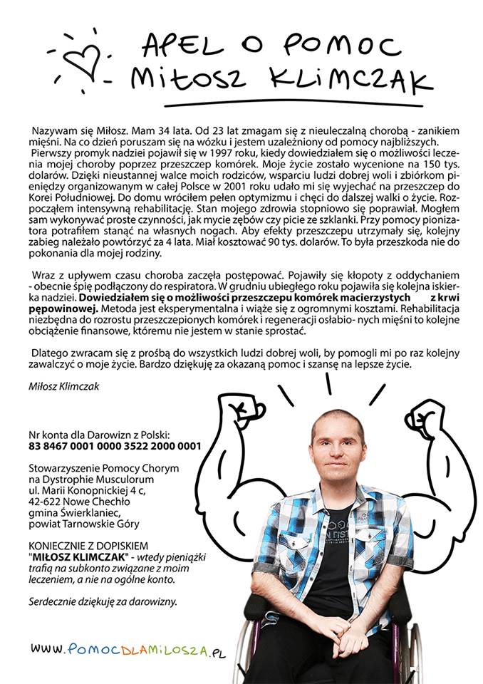 Zbieraj puszki aluminiowe dla Miłosza!Miłosz Klimczak, na co dzień sympatyczny mieszkaniec Starego Koźla, od 23 lat zmaga się z ciężką choroba - dystrofią mięśniową Duchenne’a. Jego największym marzeniem jest ŻYCIE. Leczenie eksperymentalnymi metodami do tej pory przynosiło skutek, jest jednak bardzo kosztowne. Miłosz znów potrzebuje wsparcia i apeluje do ludzi dobrej woli o pomoc. Ratunkiem ma być przeszczep komórek macierzystych z krwi pępowinowej.