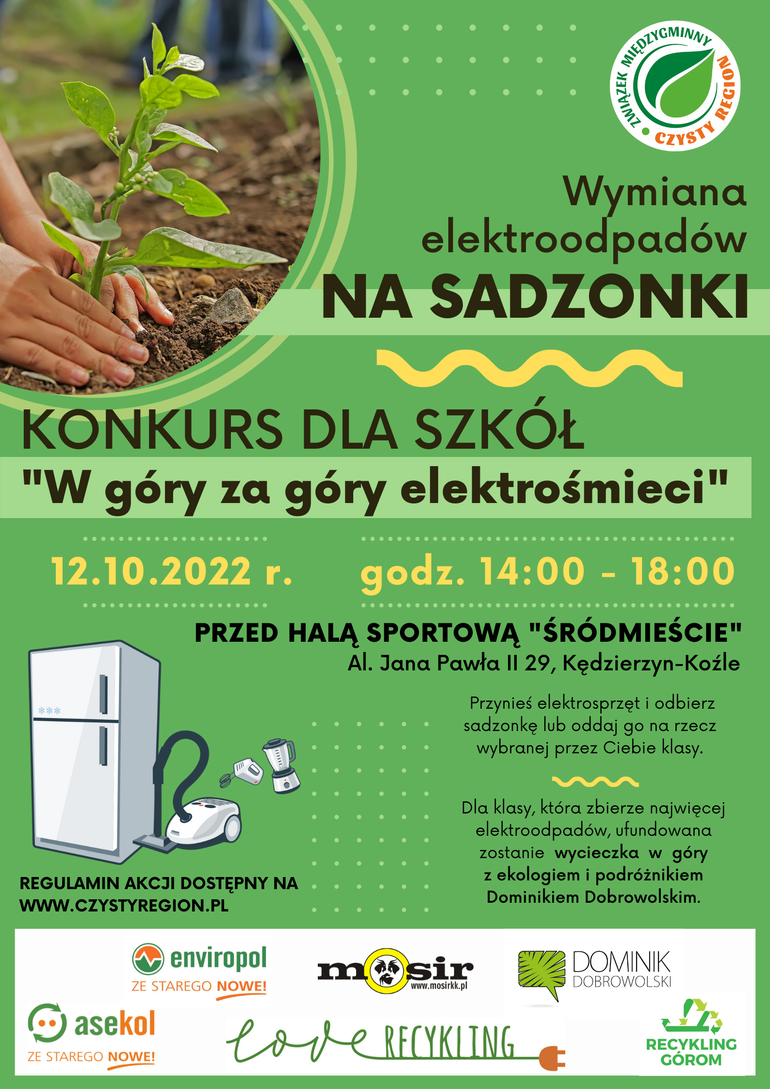 Związek Międzygminny „Czysty Region” kolejny raz zachęca do wzięcia udziału w akcji wymiany elektroodpadów na sadzonki, tym razem w połączeniu z konkursem „W góry za góry elektrośmieci” kierowanym do szkół podstawowych oraz ponadpodstawowych z terenu gmin członkowskich. Wystarczy w dniu 12 października 2022r. między godziną 14.00 – 18.00 przynieść elektrosprzęt i odebrać sadzonkę lub oddać go na rzecz wybranej przez siebie klasy. Dla klasy, która zbierze najwięcej elektroodpadów zostanie ufundowana wycieczka w góry z ekologiem i podróżnikiem Dominikiem Dobrowolskim.