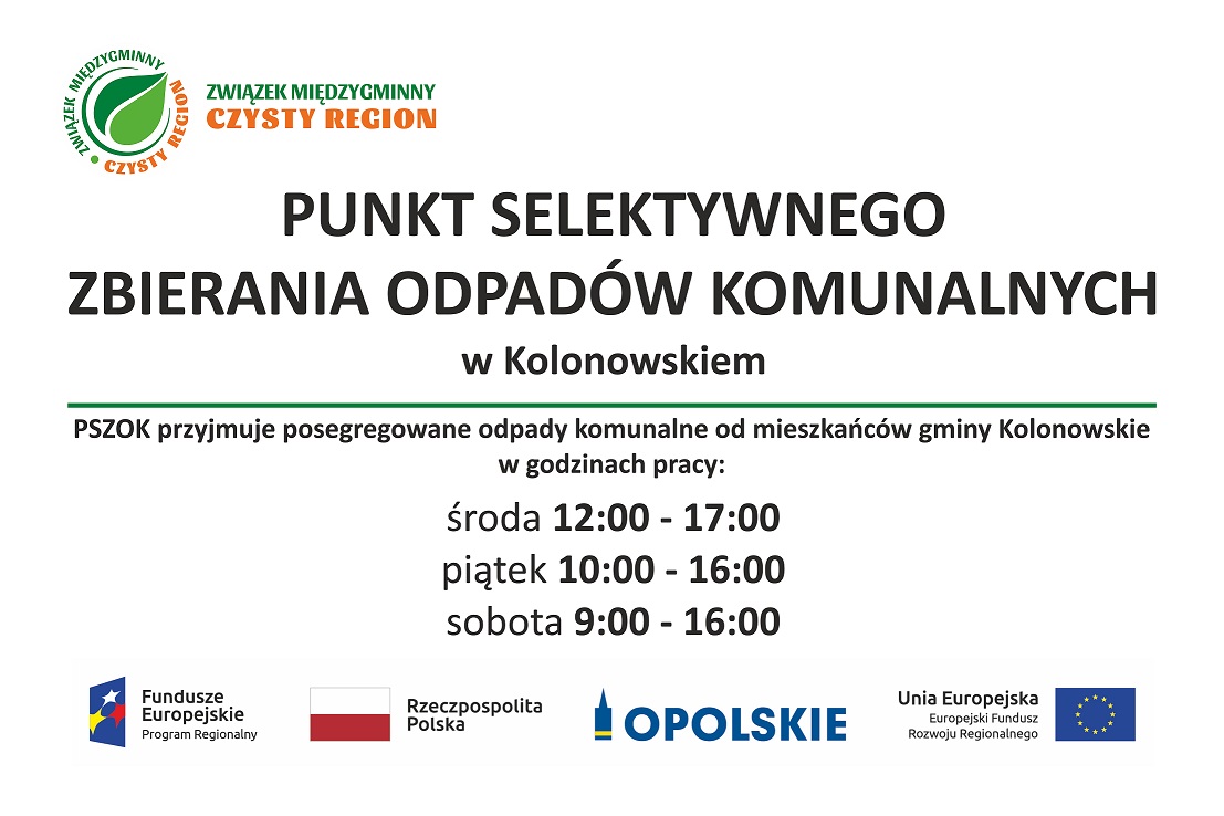 PSZOK w Kolonowskiem powstał w ramach projektu współfinansowanego przez Unię Europejską pod nazwą „Budowa PSZOK na terenie gmin Kolonowskie oraz Reńska Wieś zrzeszonych w Związku Międzygminnym „Czysty Region”. Głównym celem projektu jest zachowanie i ochrona środowiska naturalnego oraz wspieranie efektywnego gospodarowania zasobami. Budowa PSZOK przyczyni się także do wzrostu atrakcyjności gmin, jakości życia i świadomości ekologicznej mieszkańców.