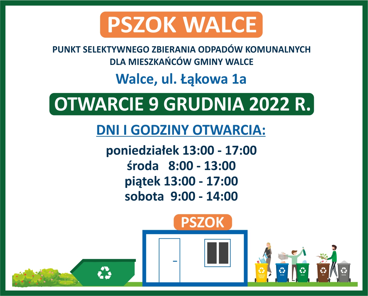 GODZINY OTWARCIA PSZOK odbierać będzie posegregowane odpady od mieszkańców gminy Walce od 9 grudnia 2022 r. w następujących godzinach pracy: poniedziałek - od godz. 13.00 do godz. 17.00